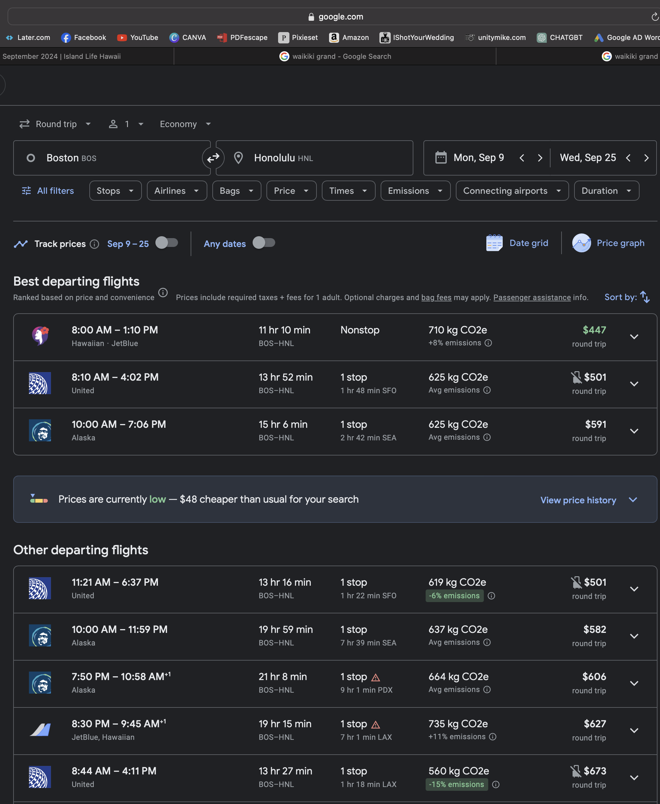 Just so you don't get scared when you start looking up the costs, keep in mind that if today you look up your home airport to HNL the cost is going to look very expensive. But as we get a little bit closer and start looking, the cost should be $350 and maybe $600 on the high end. It's going to be cheaper from California of course. the most I have ever paid was $730.
